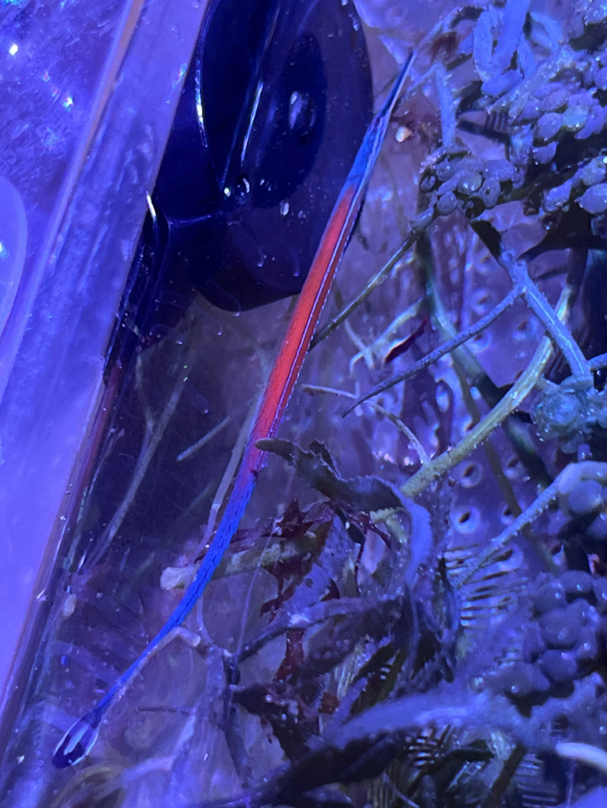 基本活き餌か冷凍餌のみ。良くみると黒っぽい面積が青く光ってかっこいい。他のヨウジ類と同じくあまり強い水流は好まないので注意。